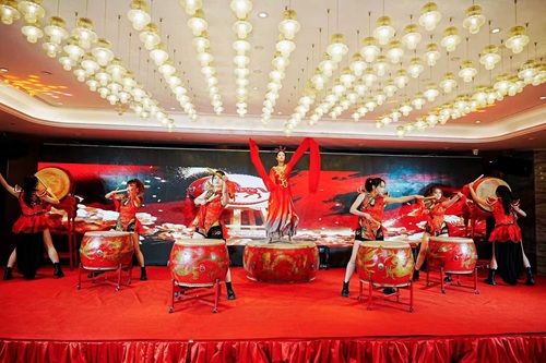 颁奖环节后,进入了联谊会的表演环节。激昂的鼓乐表演拉开序幕,身着红装的表演者们擂响祥鼓,红绸翻飞,鼓声震天,热烈奔放的节奏与喜庆雅致的舞台布景相得益彰,将现场氛围推向高潮。